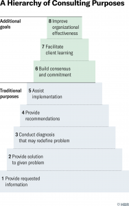 The purposes that are numbered lower on the pyramid are ones that people usually understand better, practice more, and request more often from clients. Nevertheless, many consultants who work with those clients aspire to a level higher on the pyramid in terms of both purpose and outcome than that with which they typically achieve when working on contracts.